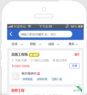 - 海量工作機(jī)會(huì)等著您,同一時(shí)刻您將面對(duì)數(shù)以十萬的工作機(jī)會(huì);幫助您記憶最近搜索條件,簡(jiǎn)化您的搜索操作。